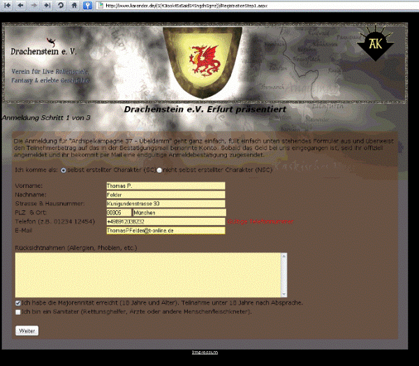 Noch ein HInweis zur Anmeldung, die Onlineanmeldung ist für den Con die bevorzugte Anmeldevariante, diese sollte im Standardfall auch genutzt werden, um den Verwaltungsaufwand für die Orga zu reduzieren. Falls jemand keine Möglichkeit hat, die Anmeldung online auszufüllen kann er eine E-mail an mich (orga[at]karandor.de) senden und ich schicke dann eine Offline-Variante zu.